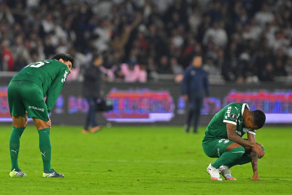 Jogadores do Palmeiras lamentam derrota por 3 a 0 para a LDU na primeira perna da semifinal da Copa Libertadores - Rodrigo Buendia - 23.out.25/AFP