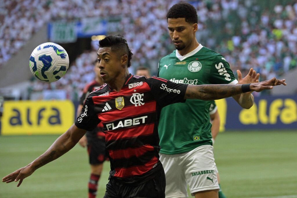 Bruno Henrique, do Flamengo, é marcado por Murilo, do Palmeiras, em jogo do Brasileiro; times podem se encontrar na final da Libertadores - Nelson Almeida - 25.mai.25/AFP