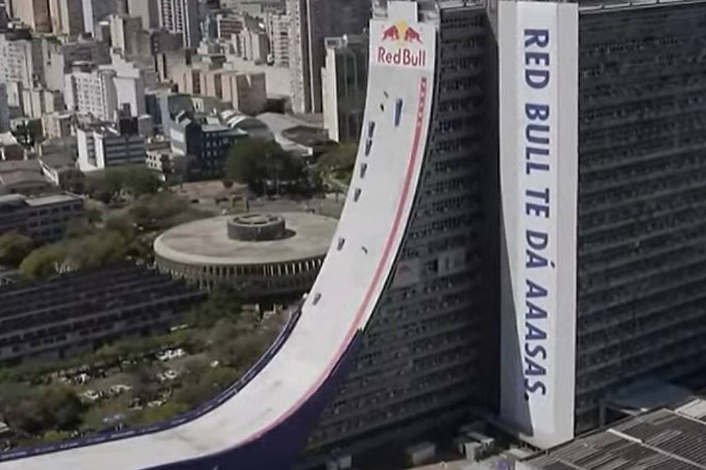 Além das estruturas montadas para a descida, o prédio recebeu letreiros da Red Bull e uma faixa vermelha estampada com o símbolo da grife Prada, parceira do evento.